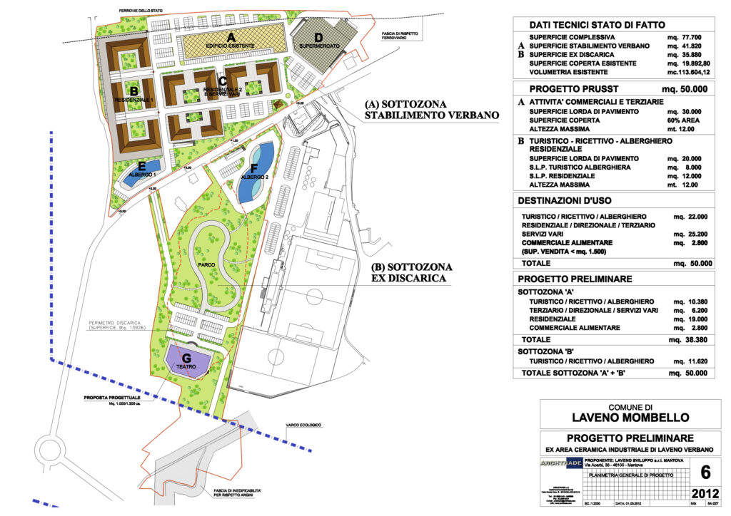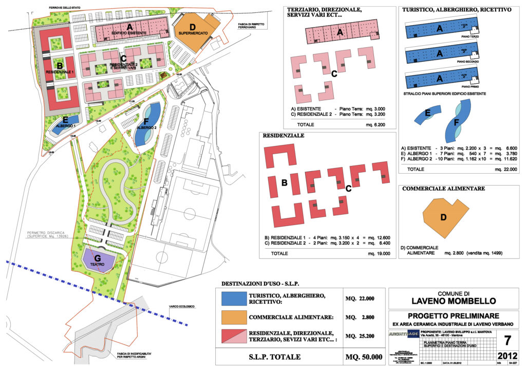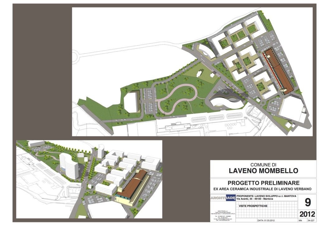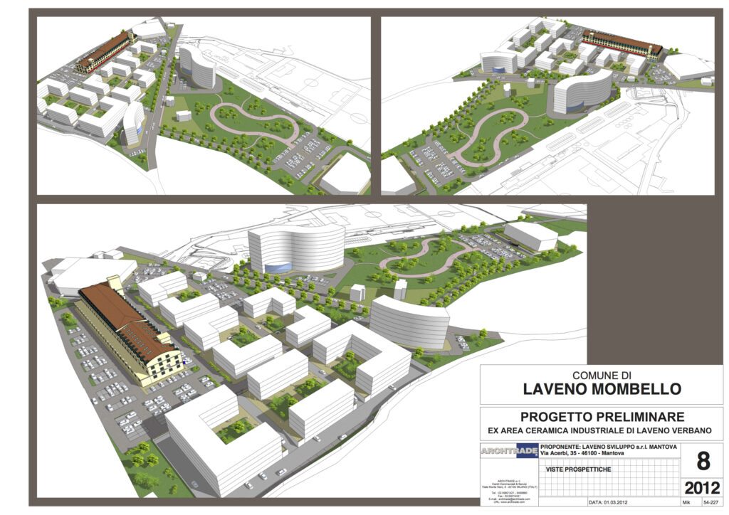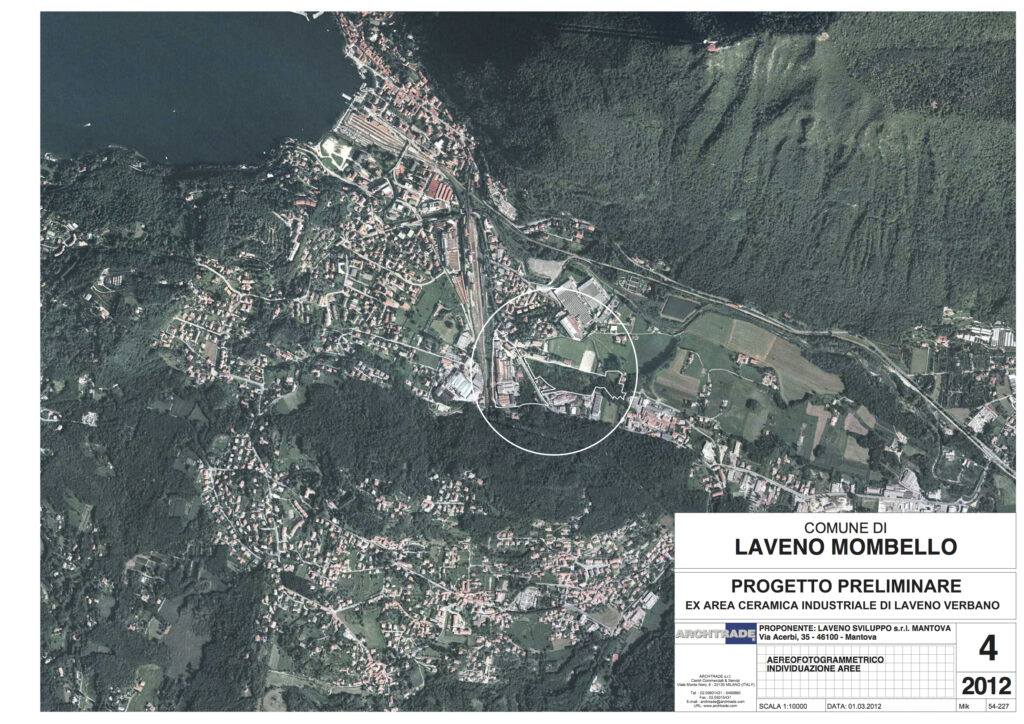 Studio di fattibilità per un intervento polifunzionale sul lago Maggiore, a Laveno Mombello. Il progetto nell’area dismessa prevede il recupero della volumetria storica dedicata alla produzione di ceramiche, e l’inserimento di nuovi comparti in due zone. Un primo comparto dedicato al turistico ricettivo, con la presenza di un albergo di categoria medio alta, per un utilizzo di superficie lorda di mq. 22.000. Un secondo comparto dedicato al residenziale direzionale e terziario per una superficie lorda di mq. 25.200. Un terzo comparto destinato al commerciale per una superficie lorda di mq. 2.800. La superficie complessiva dell’area è di mq. 77.000, la superficie lorda edificata di mq. 50.000.