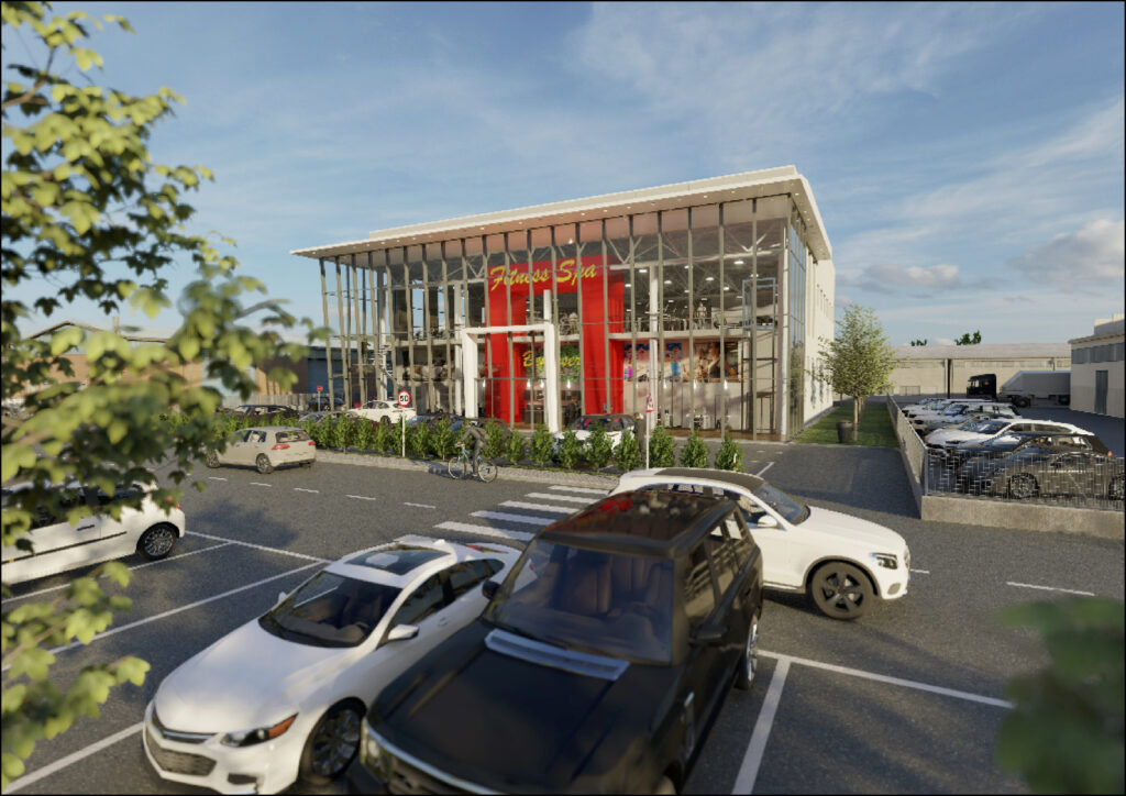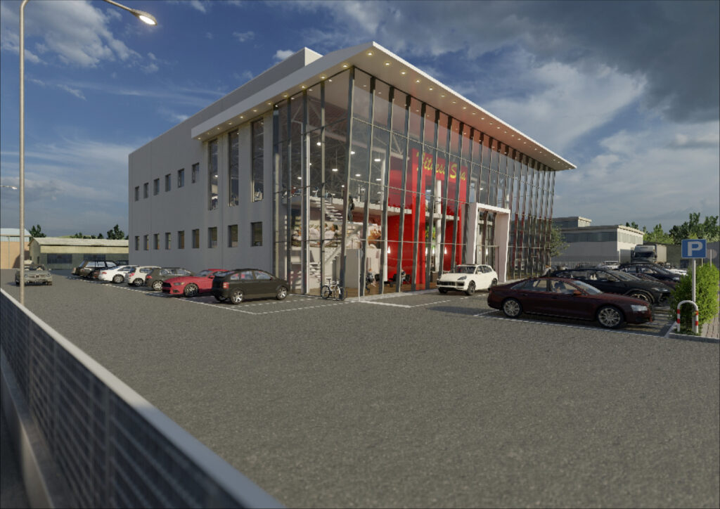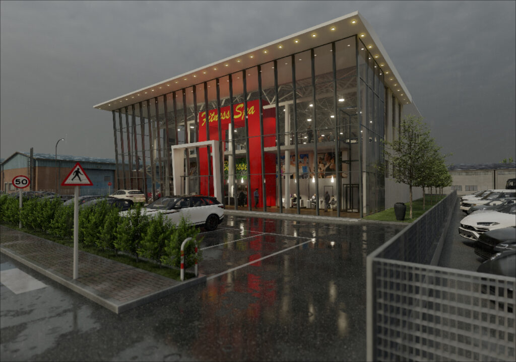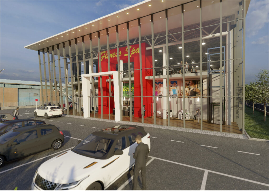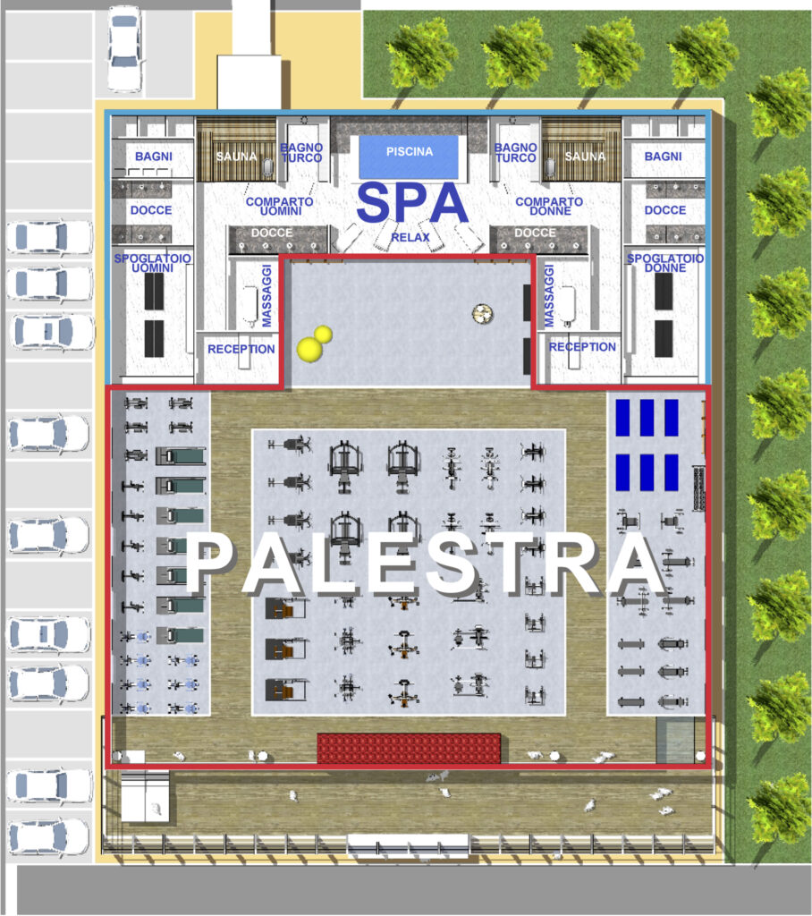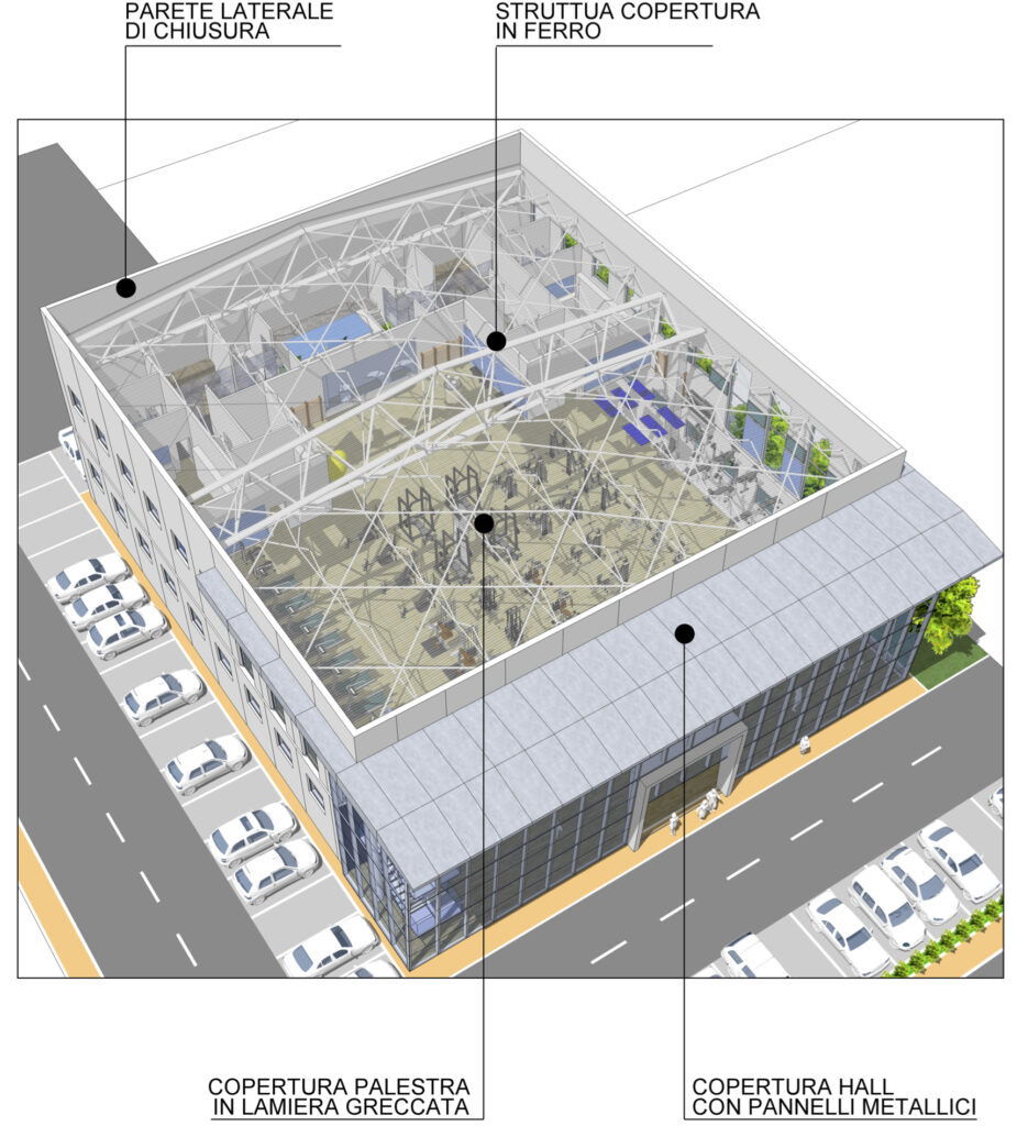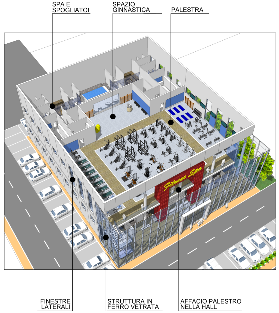 Studio di fattibilità edificio su 2 piani. La committenza aveva la necessità di usufruire del piano terra per un magazzino. Il piano terra è dunque stato concepito in prefabbricato tradizionale con un ingresso sul retro. Il secondo piano e la zona ingresso vetrata sono stati adibiti a palestra – spa e la struttura progettata in ferro. Per dare maggiore impatto visivo all’attività, la facciata principale composta da una vetrata autoportante a tutt’altezza, lascia intravedere l’interno con la zona reception al piano terra e la palestra al primo piano.