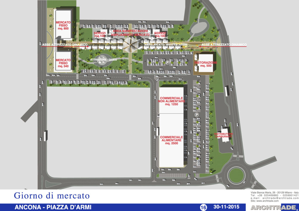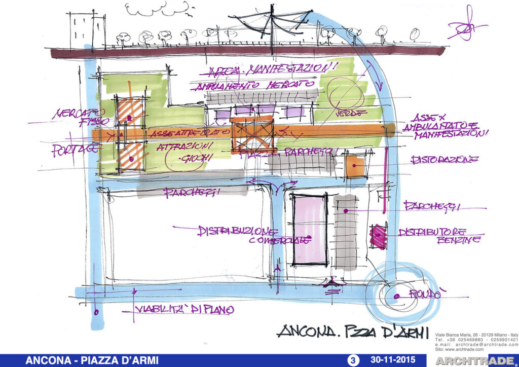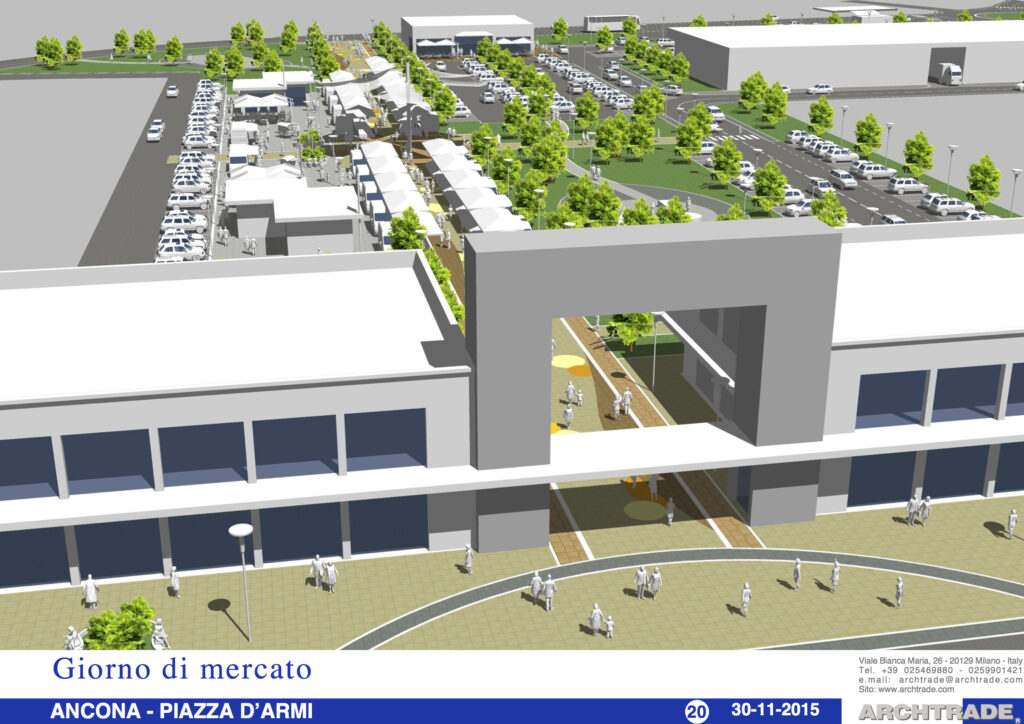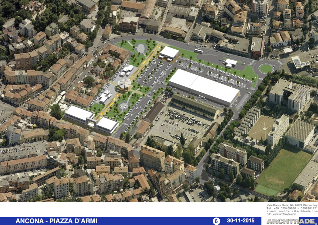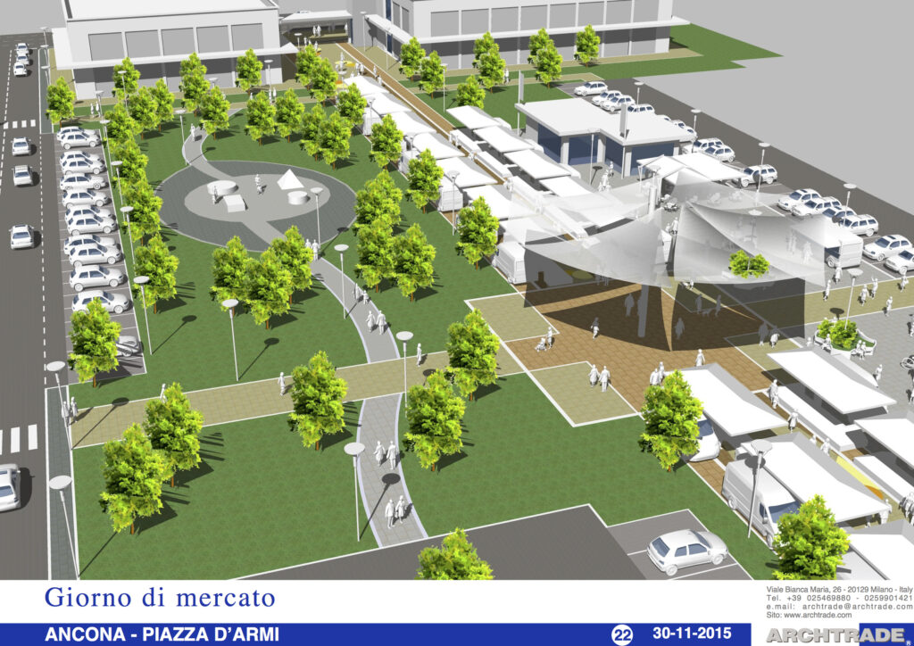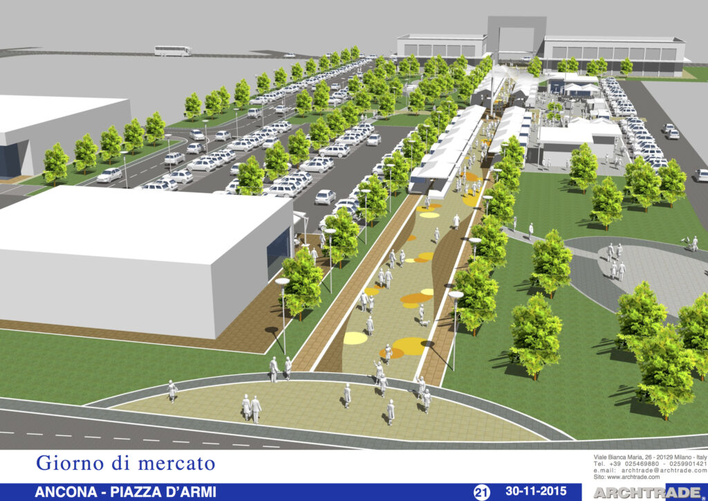 Studio di fattibilità urbanistica per la riqualificazione di un’area in Piazza d’Armi, ad Ancona. Richiesta dal comune in collaborazione con utilizzatori privati. Abbiamo inserito un parco attrezzato con un asse pedonale di collegamento a due aree urbane della città. Alle sue estremità sono state posizionate un mercato e una zona ristorazione. Nella zona centrale una piazza per eventuali manifestazioni, inserita lungo il percorso pedonale, per lo sviluppo di un mercato ambulante periodico con stalli già predisposti e una zona ludica. Un’area dedicata all’inserimento di un discount alimentare e una media superficie e stata predisposta lateralmente. La viabilità è stata studiata in modo ad alimentare i diversi parcheggi a servizio delle attività.
